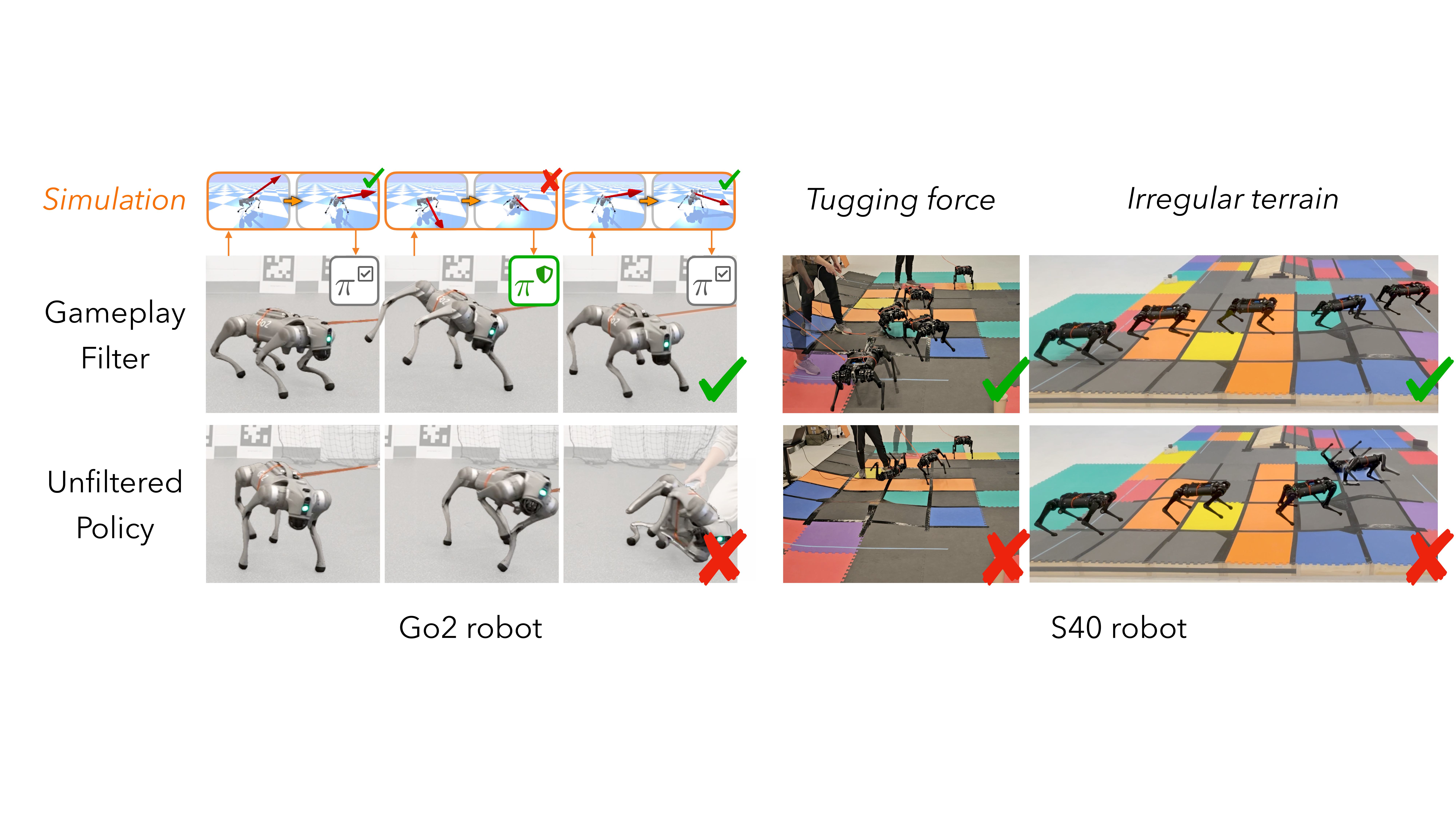 The gameplay filter (Nguyen* et al., 2024) is a new class of predictive safety filters, offering a general approach for runtime robot safety based on game-theoretic reinforcement learning and the core principles of safety filters. Our method learns a best-effort safety policy and a worst-case sim-to-real gap in simulation, and then uses their interplay to inform the robot’s real-time decisions on how and when to preempt potential safety violations.