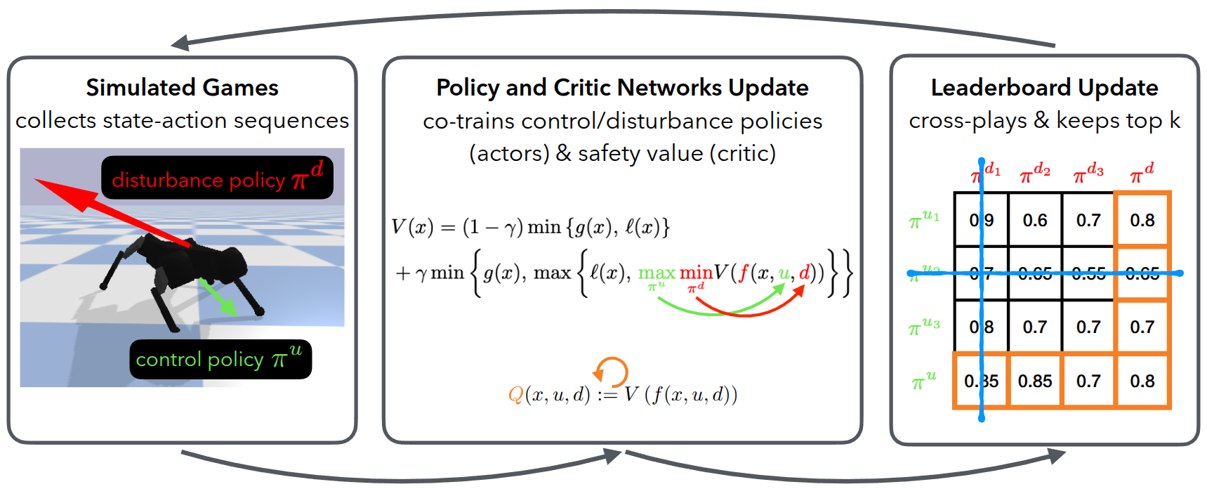 ISAACS (Iterative Soft Adversarial Actor-Critic for Safety) (Hsu* et al., 2023) is a new game-theoretic reinforcement learning scheme for approximate safety analysis, whose simulation-trained control policies can be efficiently converted at runtime into robust safety-certified control strategies, allowing robots to plan and operate with safety guarantees in the physical world.