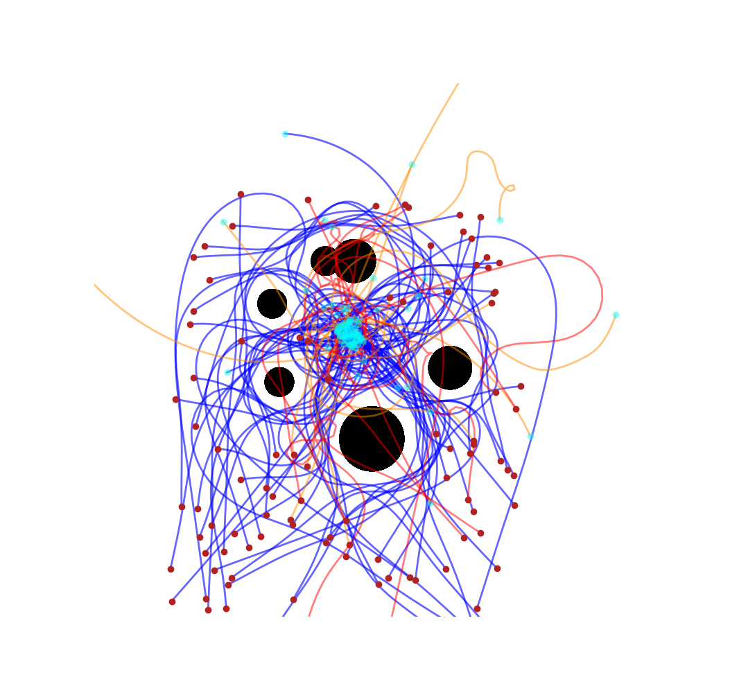 One agent navigates a free space with obstacles toward a goal while maintaining safety constraints. We show the result from both time-inconsistent (pinch-point) and time-consistent solution: